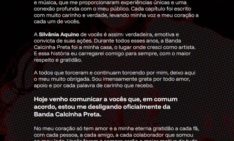 Na mensagem, Silvânia expressou gratidão, emoção e respeito à trajetória construída ao lado da banda, destacando que a decisão foi tomada em comum acordo.